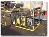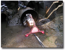 Internal Laser Alignment of Dry Pipe Using a Crawler - (WMV Video .9MB) Several lower outlets in small retention dams high in the Sierra mountains required assessment. Hibbard Inshore flew the ROV and dive equipment to the area by helicopter. A diver burned open the trash rack and inserted the crawler. The crawler inspected several of the steel lower outlets while flooded visually and with a UT gauge. The crawler also inspected one of the dry outlets visually and measured the alignment using a pipe laser and a target on the crawler. The alignment was performed to determine if the pipe could be lined. |